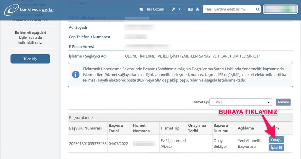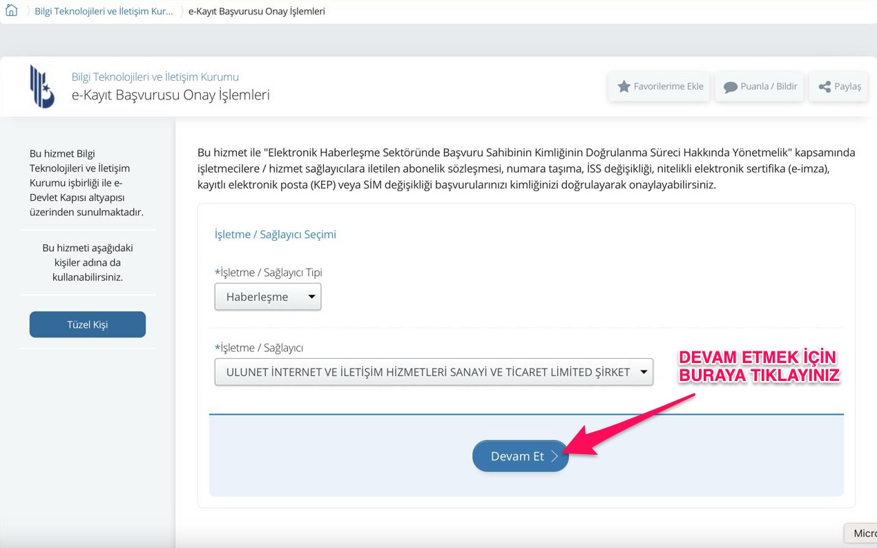 Alt kısımdaki "İşletme / Sağlayıcı" yazan bölümden ise "ULUNET INTERNET VE İLETİŞİM HİZMETLERİ SANAYİ VE TİCARET LİMİTED ŞİRKETİ" seçeneğini seçip, "Devam Et" butonuna tıklayınız.